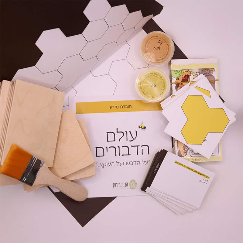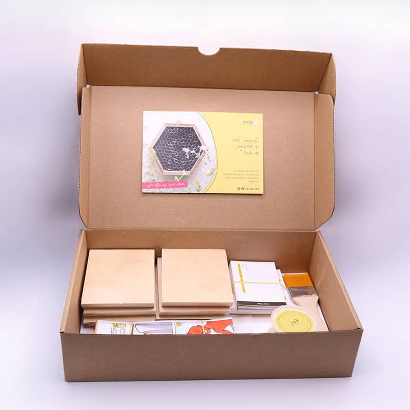 הערכה כוללת: חוברת מידע על דבורים, לוח משחק פיצוחים, לוחות עץ, דבק נגרים,
